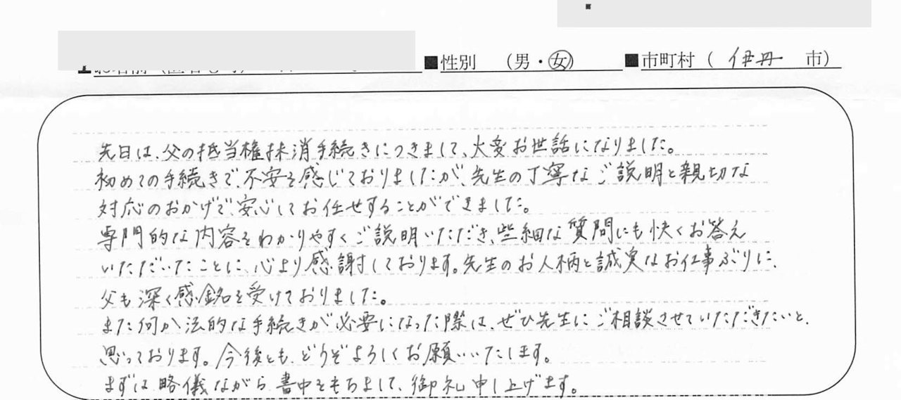 先日は、父の抵当権抹消手続きにつきまして、大変お世話になりました。初めての手続きで、不安を感じておりましたが、先生の丁寧なご説明と親切な対応のおかげで、安心してお任せすることができました。専門的な内容をわかりやすくご説明いただき、些細な質問にも快くお答えいただけたことに、心より感謝しております。先生のお人柄と誠実なお仕事ぶりに、父も深く感銘を受けておりました。また、何か法的な手続きが必要になった際には、ぜひ先生にご相談させていただきたいと思っております。今後とも、どうぞよろしくお願いいたします。まずは略儀ながら書中をもちまして、御礼申し上げます。