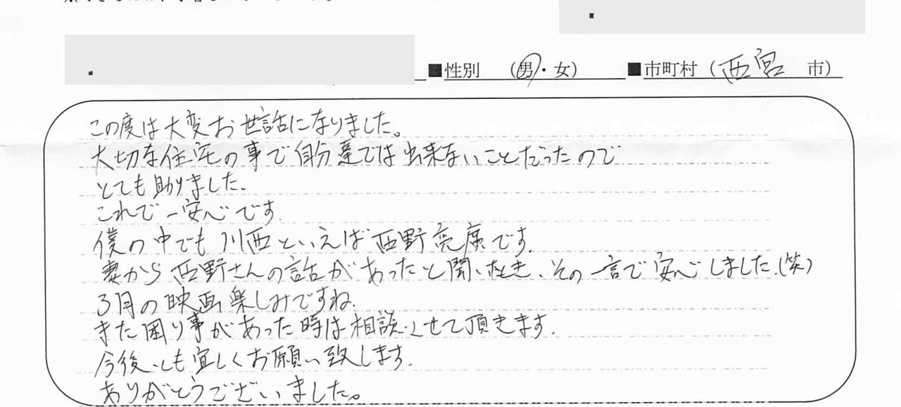 初対面にもかかわらず、親しく接していただきありがとうございました。やはり、地元(川西市)で開業されておられましたので、手続きをお願いした次第です。早い対応ありがとうございました。