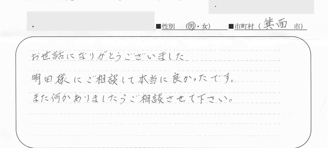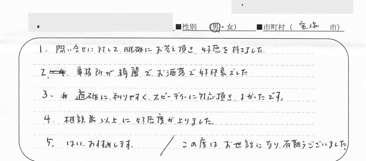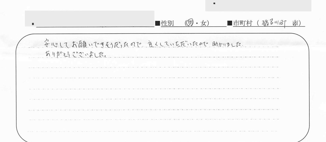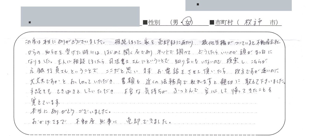 この度はお世話になりありがとうございました。電話をさせて頂いた時に丁寧に対応して頂き、費用も教えて頂き安心しました。手続きでお伺いした時もスムーズでした。三度のお手紙もお人柄が表れて素敵な内容でした。また何かありましたら相談にのって頂きたいと思います。