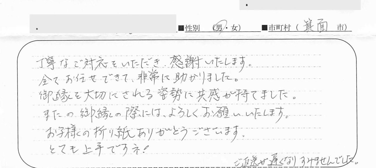 この度は初めての不安な手続きの中、とてもご丁寧な対応をして頂き安心してお任せする事が出来ました。良心的価格、スピィーディー、ご丁寧な対応で、又何かありましたらお願いいたします。