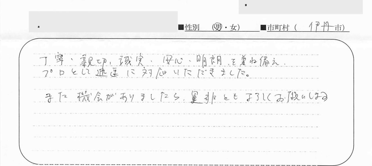 いつもお世話になっております。今回はお世話になり有難うございました。お伺いする前は、とても不安(料金面や対応面)でしたが、とても分かりやすく説明してくださり、しかも思ってたよりもリーズナブル、あと、明田様の対応がとても親切で不安がふっとびました。今後もまた何かあればお願い致します。