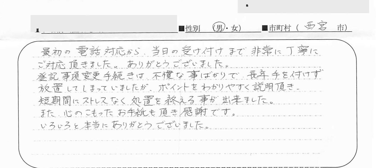 最初の電話対応から、当日の受け付けまで、非常に丁寧にご対応頂きました。ありがとうございました。登記事項変更手続きは、不慣れな事ばかりで、長年手を付けず放置していまっていましたが、ポイントをわかりやすく説明頂き、短期間にストレスなく処置を終える事が出来ました。また、心のこもったお手紙も頂き感謝です。いろいろと本当にありがとうございました。
