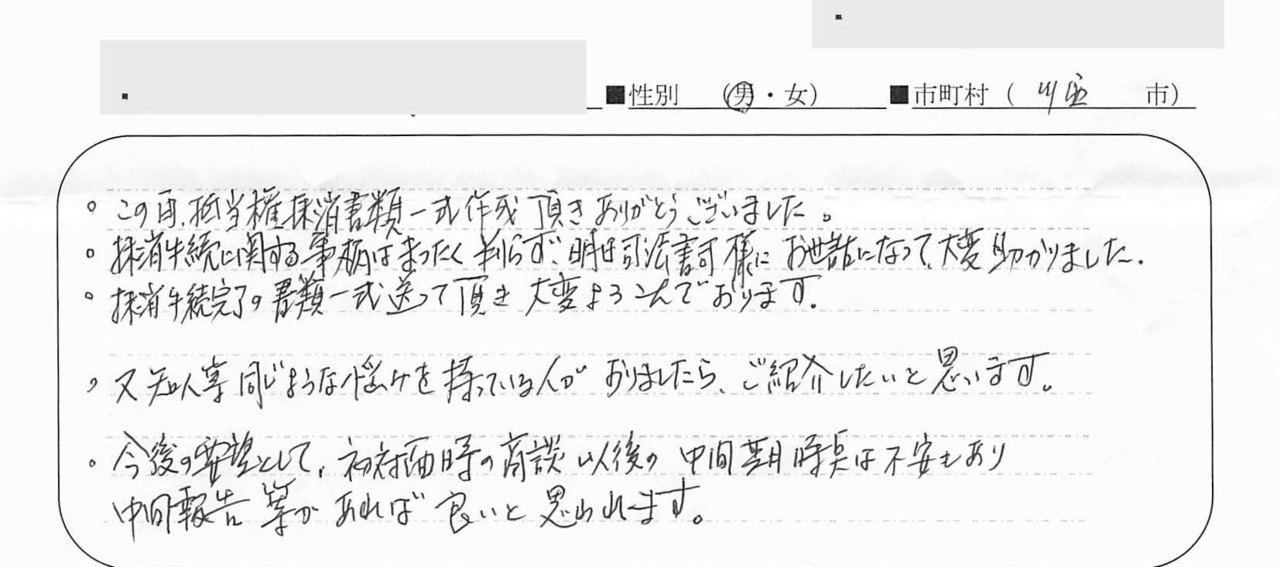 明田様、この度は抵当権抹消手続きについて迅速な対応ありがとうございます。訪問時、ていねいに説明いただきわかりやすかったです。この様な手続きは苦手なので、わかりやすくまとめて下さり、何度かのお手紙で安心させていただきました。次回、何かありましたら、その時は宜しくお願い致します。